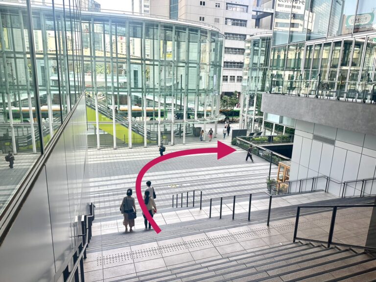 目の前にある大きな階段で地上へ下り、右へ進みます。