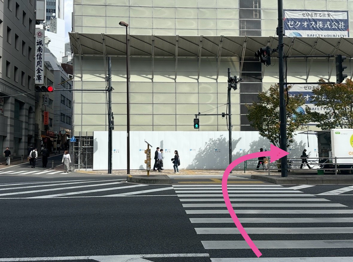 最初の信号で、左側へ横断歩道を渡り右へ進みます。